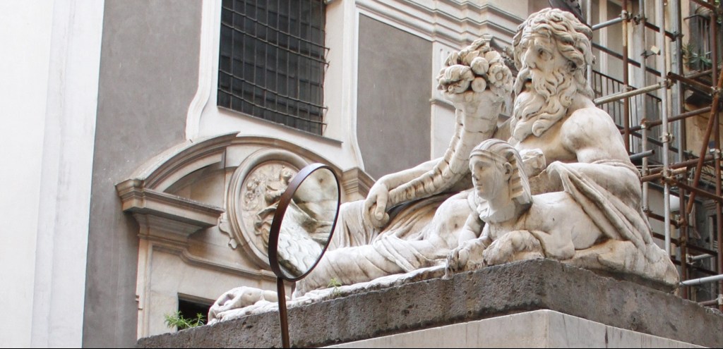 Lo specchio rimanda anche a un altro livello di visione: quello del sogno, che guida questa mia ricerca, e quello degli aspetti misterici legati al culto di Iside, che è la matrice sia dei manufatti del Tempio di Iside sia della statua del Nilo. Lo specchio è un segno che evoca il sorgere del sole e i concetti ad esso legati: luce, nascita, protezione e resurrezione, quest’ultimo concetto sviluppato proprio intorno al culto di Iside e Osiride. Infatti, lo specchio svolge diversi ruoli rituali: nei manufatti appartenenti ai culti e alle culture legate all’antico Egitto, appare raffigurato nelle danze e vicino al letto da parto durante l’allattamento, compare negli arredi funerari e viene offerto alle divinità, solitamente Iside o Hathor. Lo specchio, un’allegoria della natura ciclica del tempo e la rivelazione attraverso l’illuminazione e il rispecchiamento, è anche, insieme al pettine, un attributo iconografico della Sirena, e il Nilo, in quanto Corpo di Napoli, ovvero Corpo di Partenope, contiene, anche se per risonanza con le attribuzioni popolari, il corpo della Sirena. Lo Specchio Odontoiatrico Colossale sta a Flora (e al Nilo) come un’offerta che faccio agli esseri umani per osservare i sistemi di interconnessione e interdipendenza tra la nostra specie e quelle che rendono possibile il nostro essere nel mondo: siano esse orzo, grano e api o quelle a noi sconosciute. Invito a guardare alla Flora Maggiore, dea della fioritura dei cereali e di altre piante commestibili, come segno del compimento dell’incontro tra terra e acqua, tra Iside e Osiride.