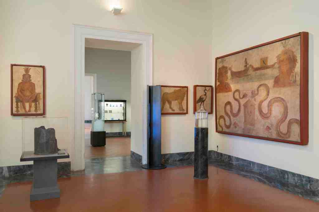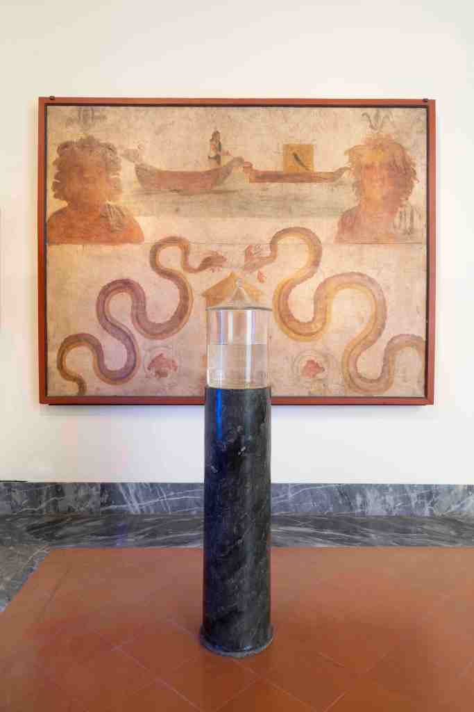 installation: fresco, blown glass vase, water, led sign, sentence, marble column from the MANN depository