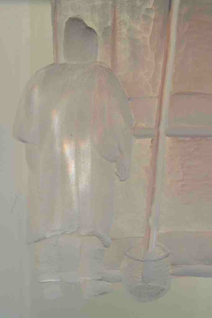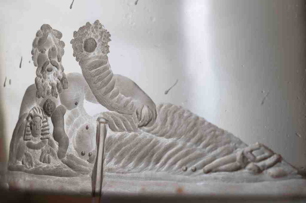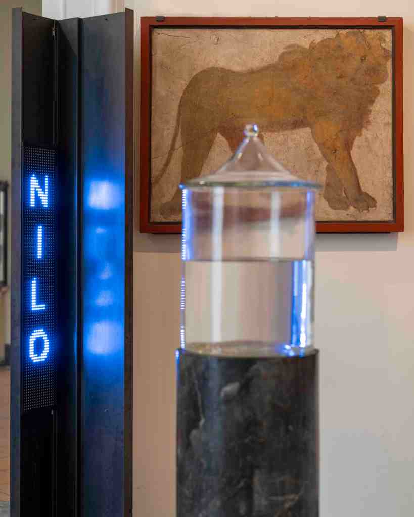 A blown glass vase is superimposed like a pictorial veil over the mystical cyst represented in the Navigum Isidis fresco. The vase echoes in its form the features of the cysta, but instead of the inverted half-moon, it bears an engraved image of the Nile (Corpo di Napoli) with a human collecting the water that drips from the marble during rain. The water contained by the vase is in fact the result of the multiple actions by which the artist has collected water from the monument over the course of 2023.